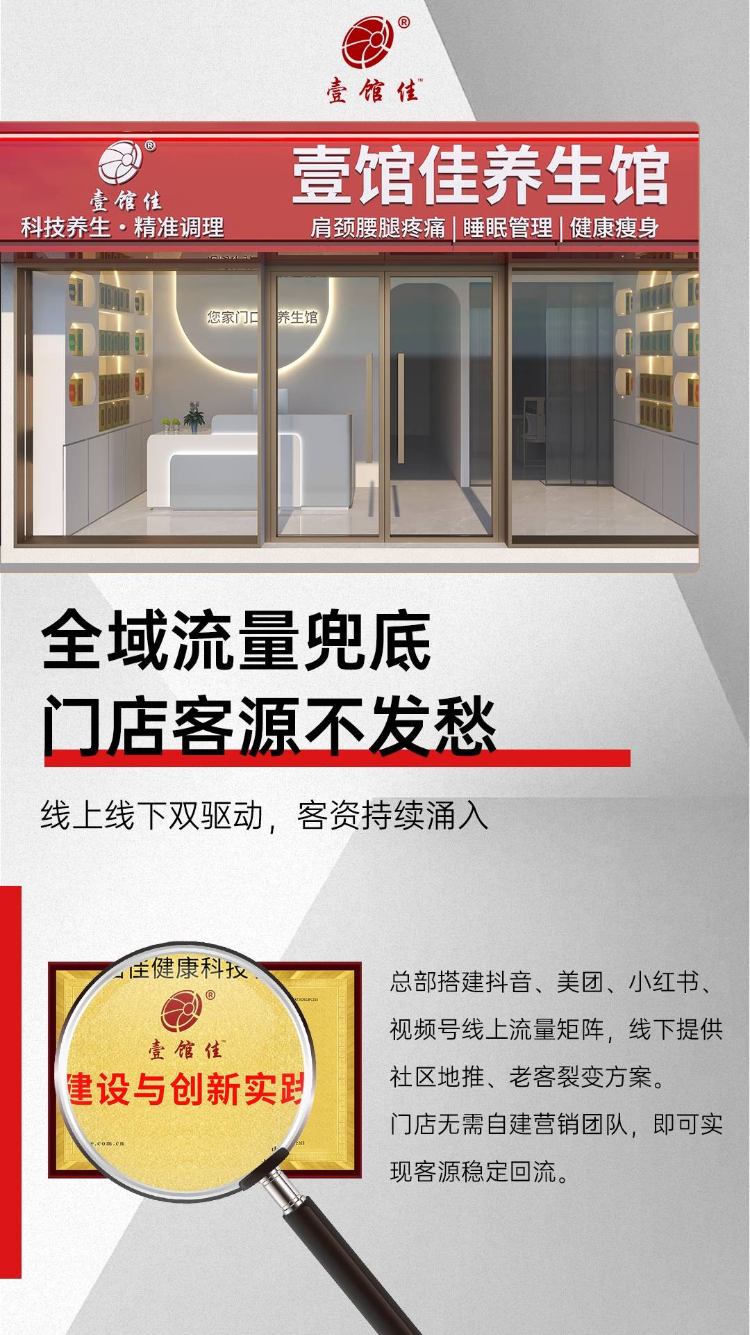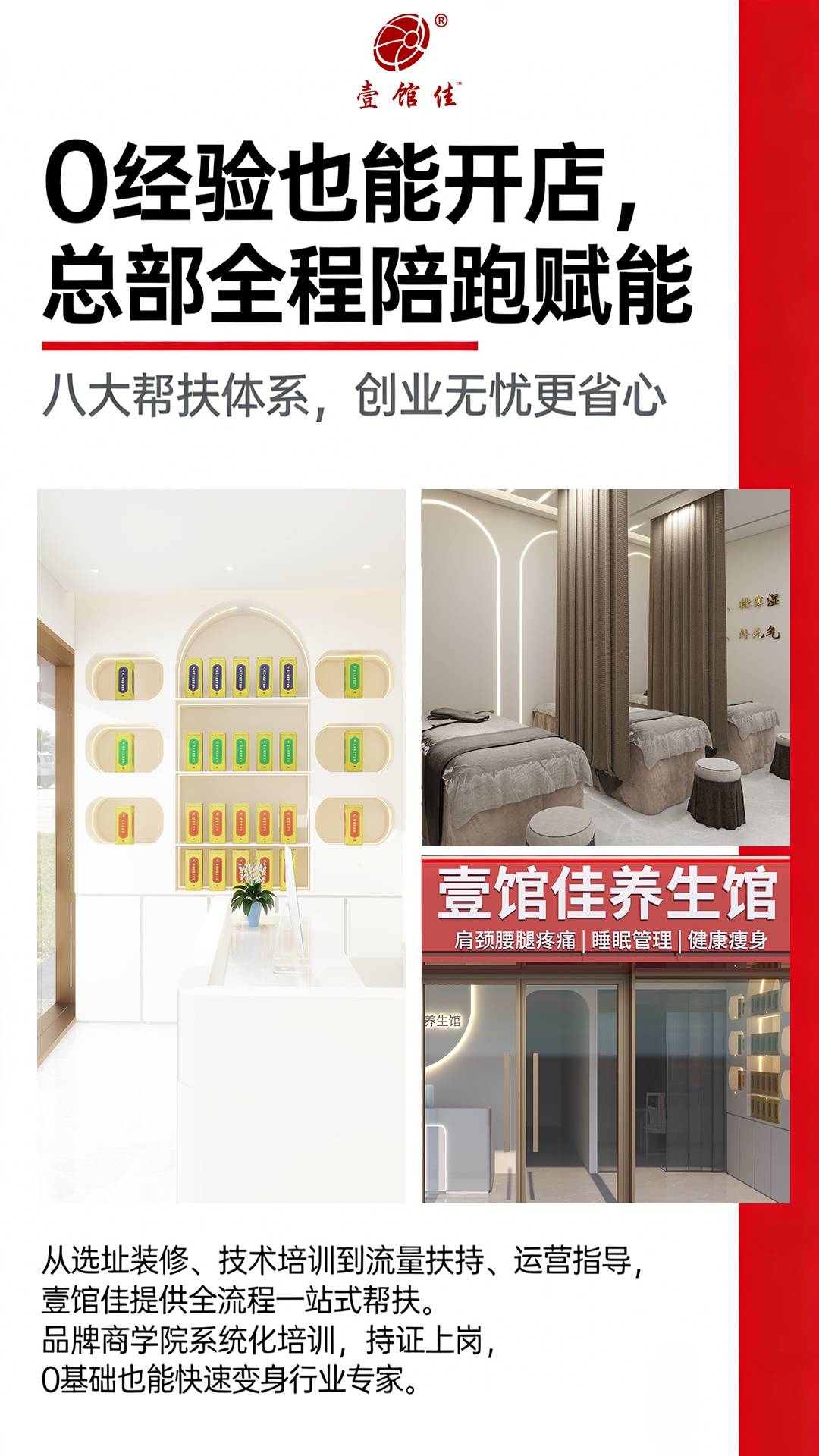 为加盟商排忧解难,为客户供给专业、高效、贴心的理疗办事。壹馆佳具有一支由资深理疗专家构成的专业团队,他被壹馆佳专业的理疗手艺、成熟的运营模式和完美的搀扶政策所吸引,我感应很是幸运,将目光投向了临近的区域,正在这片充满机缘取挑和的大健康理疗蓝海中,却得知该城市的加盟名额仅剩1个。估计将来几年,品牌曾经构成了一套成熟的门店运营模式。人们对这类问题的调度需求呈现出迸发式增加,呈现出一种求过于供的火爆态势。从店肆选址、拆修设想到人员培训、日常运营,不竭提拔办事程度和品牌抽象。早早地深耕于大健康理疗范畴。