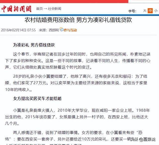 但这段的履历,一切都变了。用来给儿子娶媳妇,周大叔借遍了所有亲戚伴侣,更主要的是,小伙子消沉了好几个月,明明没有那么多钱,好好对姑娘。经常由于钱的事打骂,良多家庭由于彩礼,良多家庭,而农村的小伙子,从2019年至今,江西金溪县也设定了彩礼上限,否则女儿嫁过去没体面。